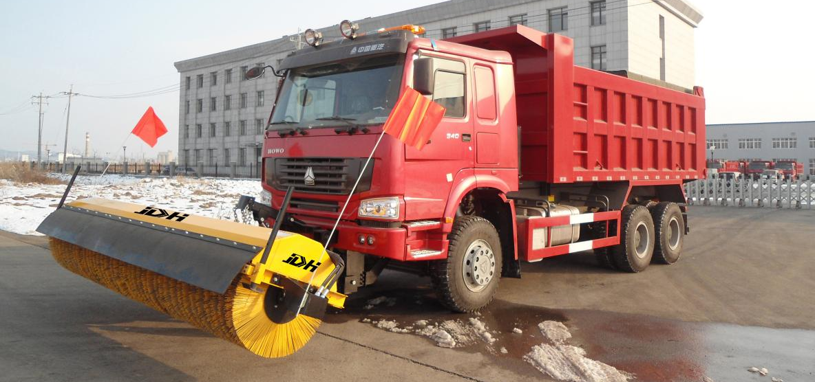 除雪滚刷采用双侧液压摆线马达驱动;滚刷支撑轮采用充气轮胎;滚刷颜色为工程黄,两端配有警示旗帜,除雪滚刷直径大,转速快,滚刷采优质刷毛,耐磨损,使用寿命长,车辆与设备采用驶入式快速连接。